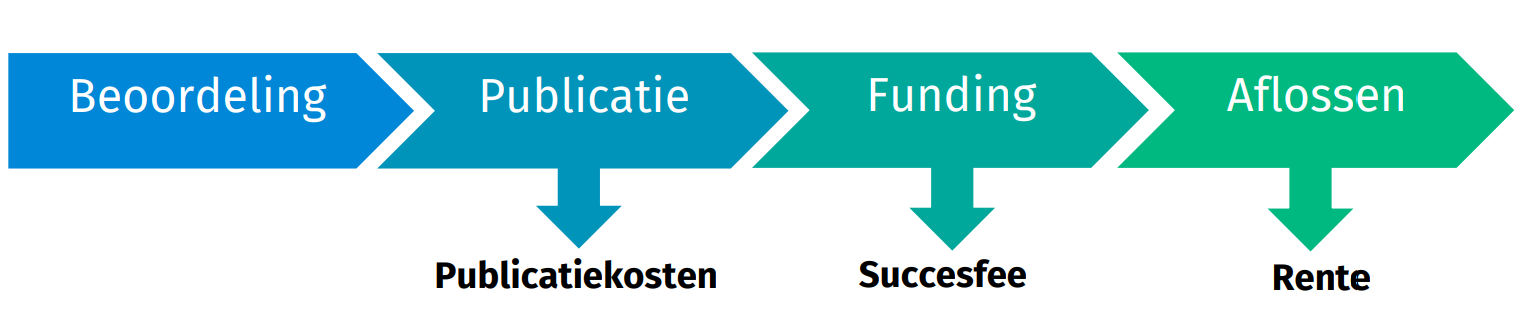 Publicatiekosten: € 750,- Succesfee: Eenmalig 2,4% over het leenbedrag. Doorloopfee: bedraagt 0,07% per maand over het initiële leenbedrag. Contractkosten: € 750,- |